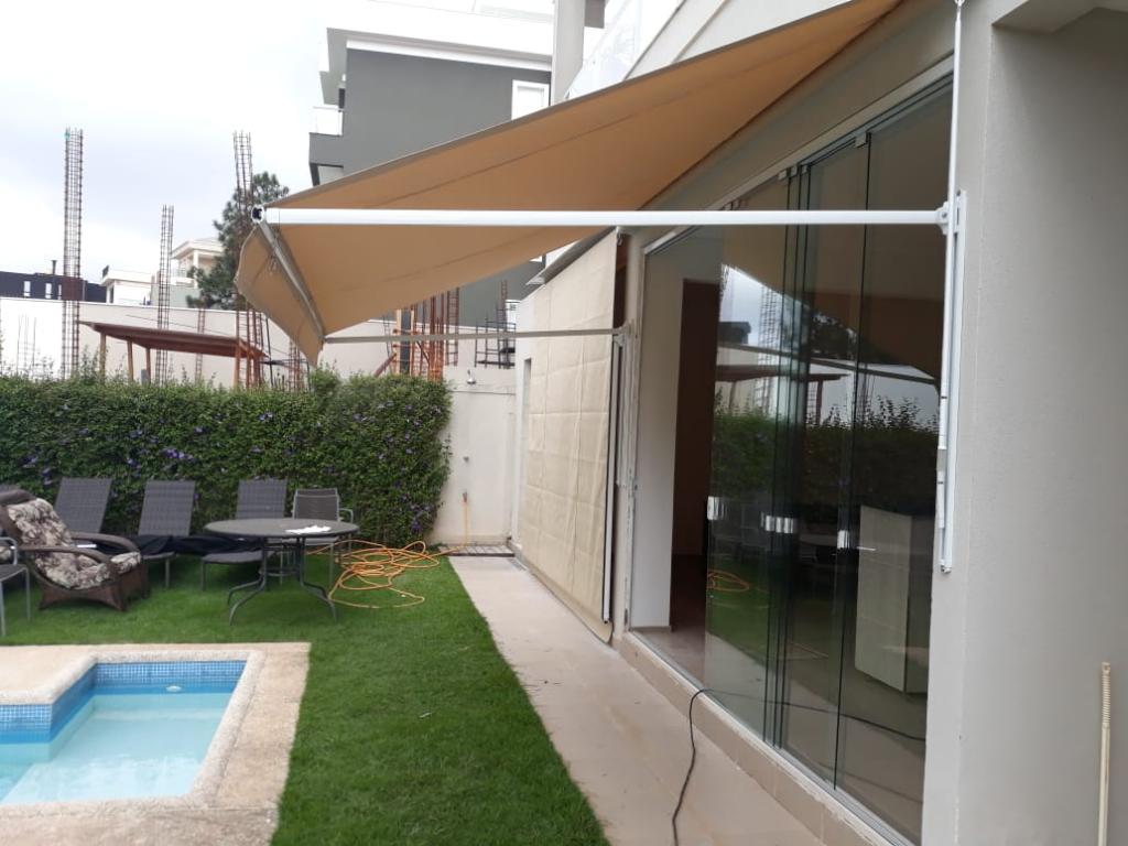 Ao manusear o toldo, os braços possuem uma articulação que possibilita que eles se recolham juntamente com a lona, permitindo assim a regulagem da projeção do toldo de acordo com a necessidade do momento ( de entrada ou não ) de luz e arejamento.